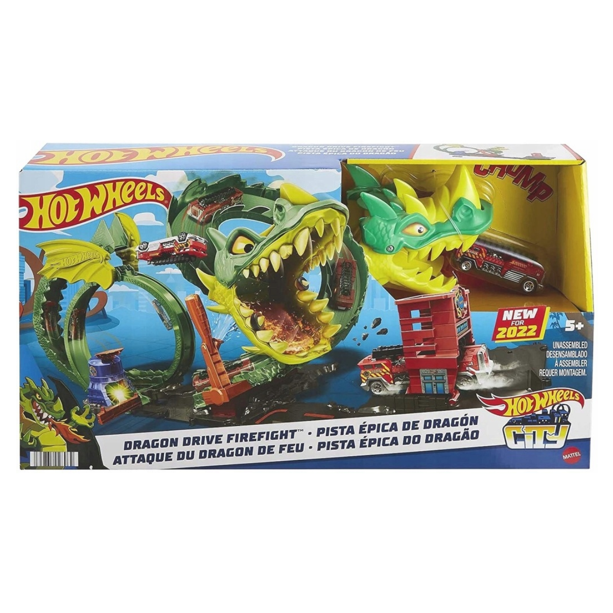 Zestaw Hot Wheels™ City Pętla Smoka to wyjątkowa zabawka, w której dzieci stawiają czoła groźnemu smokowi o imieniu Dante! Gdy ten „ożywa”, niszczy remizę strażacką i pożera wszystkie samochodziki, które znajdzie na swojej drodze. To wyzwanie pełne emocji, które pobudza kreatywność i zdolności kaskaderskie!