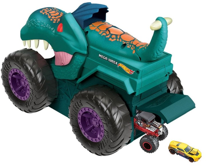 ​Ogromny pojazd Hot Wheels Monster Trucks Car Chompin’ Mega Wrex ożywa ze światłami i dźwiękami! Popchnij jego ogon, a Mega Wrex pożre samochody odlewane w skali 1:64 i Monster Trucki Hot Wheels.