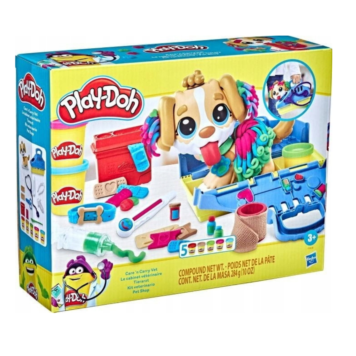 Czas na badania kontrolne tego szczeniaczka! Mali weterynarze mogą zająć się tym uroczym pieskiem. Sprawdź, jak możesz się z nim bawić – spraw, by piesek wystawił język, pielęgnuj go i ułóż jego sierść na trzy różne sposoby. W zestawie znajduje się uroczy transporter z miejscem do przechowywania – możesz umieścić w nim szczeniaczka, a potem wyjąć go, kiedy tylko chcesz! W transporterze z łatwością przechowasz wszystkie potrzebne akcesoria, takie jak nożyczki czy stetoskop – jest ich całe mnóstwo! Play-Doh Wizyta u weterynarza to doskonały pomysł na prezent dla 3 latka – jest tak wiele możliwości kreatywnej zabawy, gdy dzieciaki przeistaczają się w małych weterynarzy!