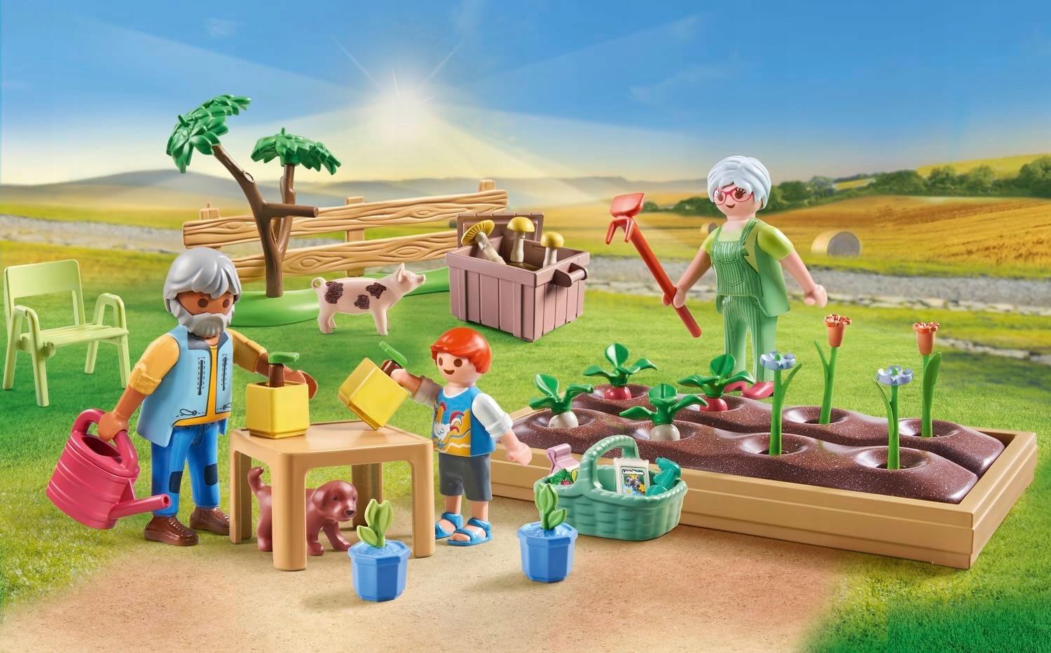 Uprawa warzyw w idyllicznym ogródku u dziadków PLAYMOBIL! Ten bogato wyposażony zestaw dla dzieci w wieku od 4 lat pobudza wyobraźnię i zachęca do zabawy w odgrywanie ról. Zestaw zawiera dziadków i wnuka, a także prosiaczka i szczeniaczka. Wykonany został średnio w ponad 80% z ekologicznych materiałów i podczas zabawy uczy o zrównoważonym rozwoju i ochronie środowiska. Po podlaniu grządek, można obserwować „rosnące” kwiaty. Grzyby są uprawiane w drewnianej skrzynce, z miejscem na nowe sadzonki. Ciekawy zestaw do niekończącej się zabawy!